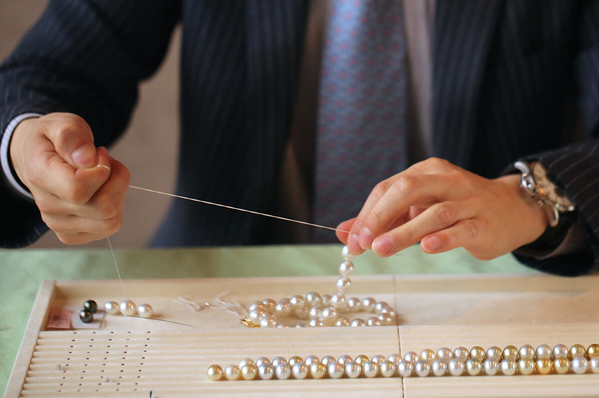 パールネックレスに使用されている絹糸やワイヤーは、湿気や汗、汚れの影響で徐々に劣化していきます。大切な冠婚葬祭などの場面で突然切れてしまうことを防ぐため、耐久性としなやかさに優れた「GPT糸」への交換をおすすめしています。