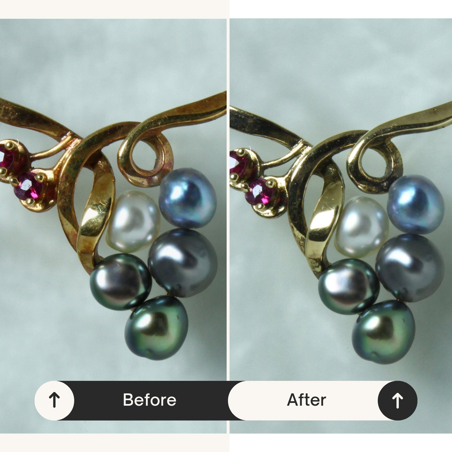 真珠はデリケートなため、超音波洗浄は使用できません。ERIS VELINAでは、真珠専用のイオン洗浄技術を用いて、真珠と地金のすき間に入り込んだ汚れをやさしく取り除くとともに、変色した地金も丁寧に修復します。