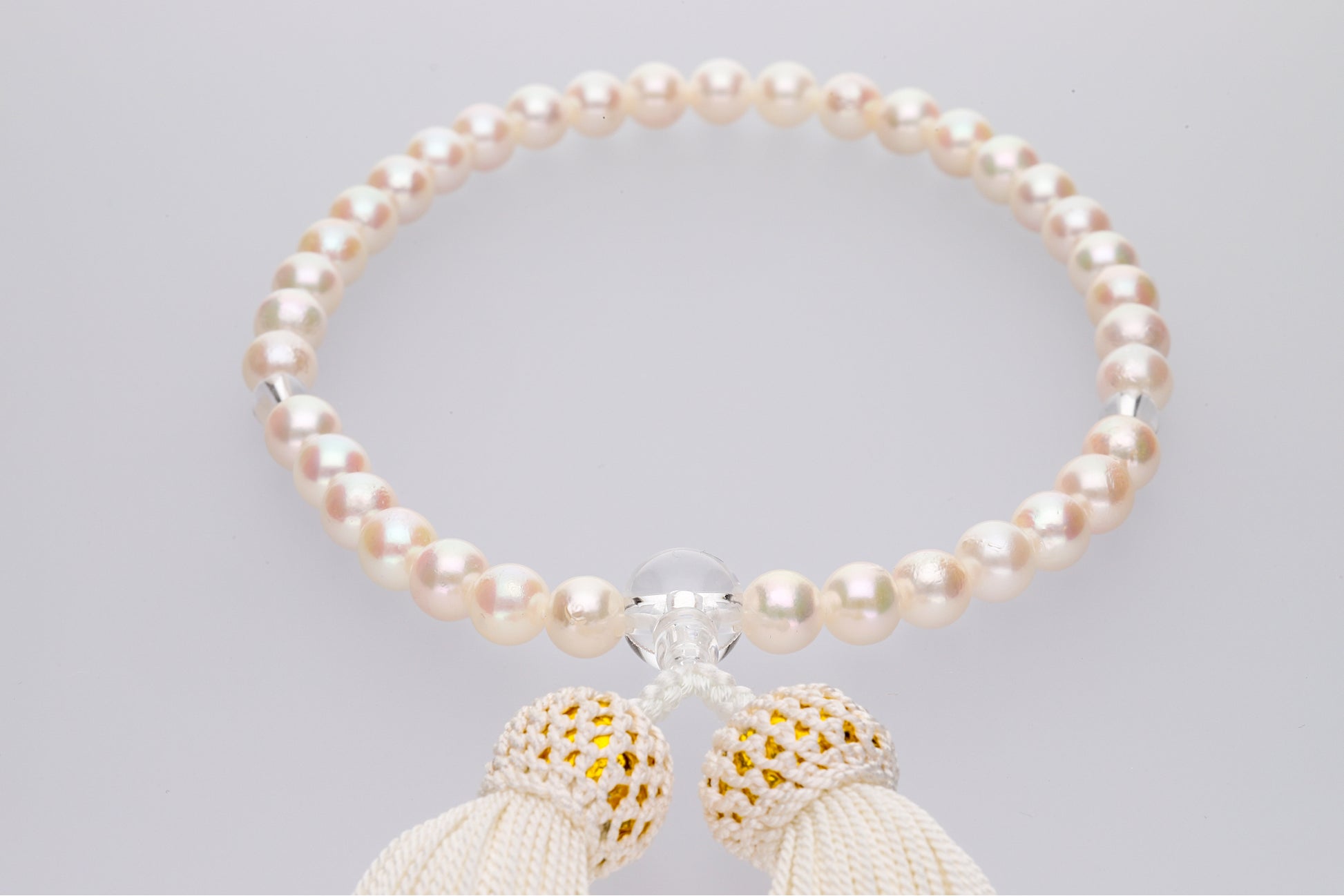数珠は直接手で触れる機会が多く、汗の酸によって真珠が劣化しやすい仏具です。ERIS VELINAでは、真珠を内側から強くする技術「PS加工(パーマネントシャイン加工)」を施してお仕立てします。