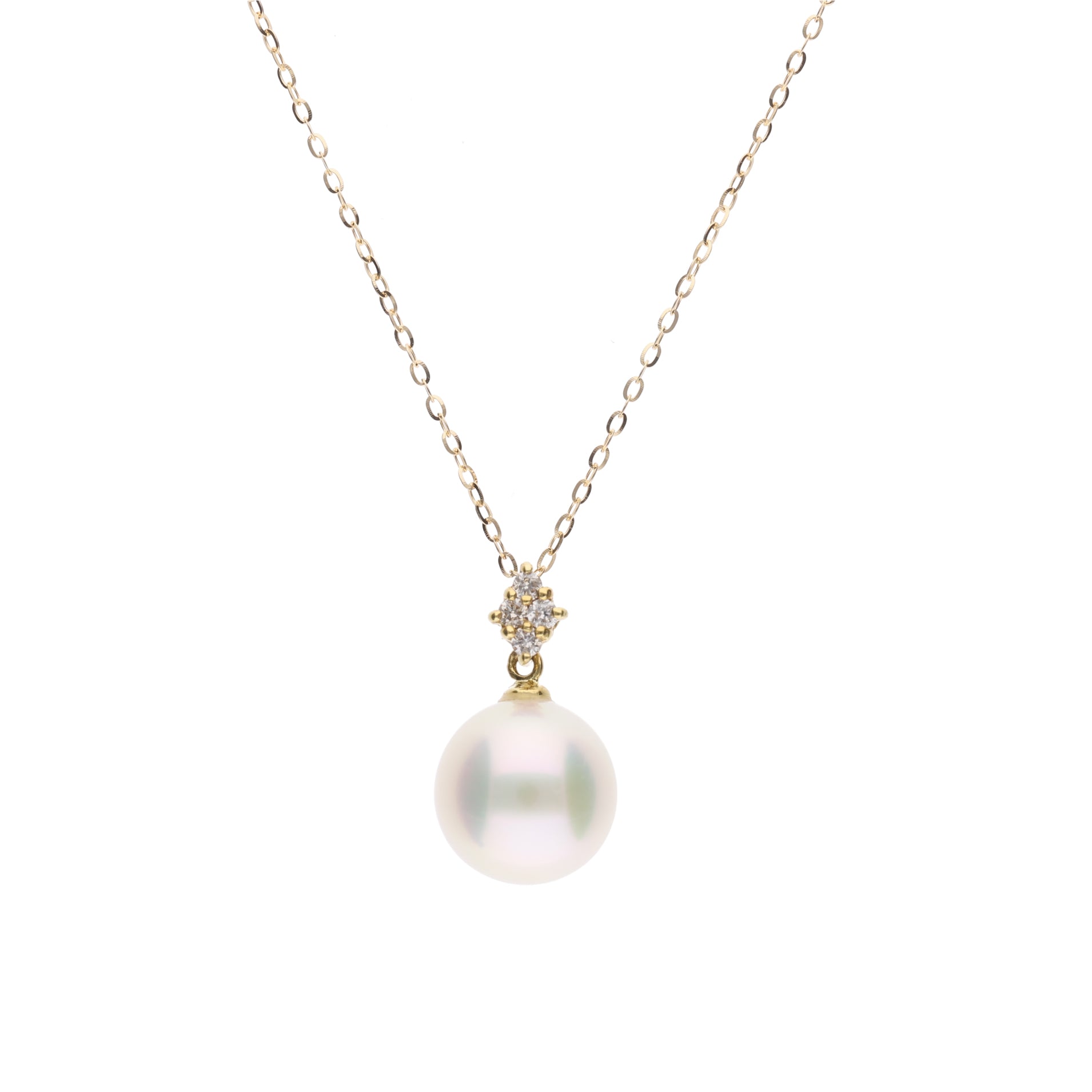 - ■ 4石の天然ダイヤモンド: センターに配置された4石の天然ダイヤモンド(合計0.05ct)が、菱形のシャープなラインで真珠を美しく際立たせます。